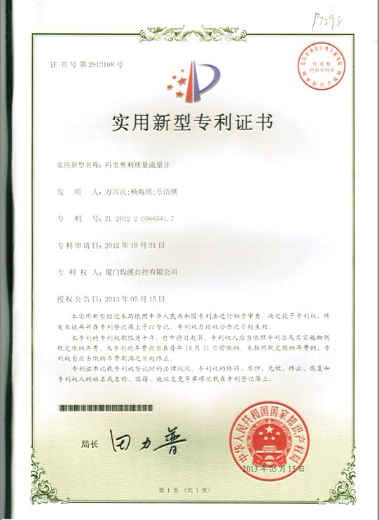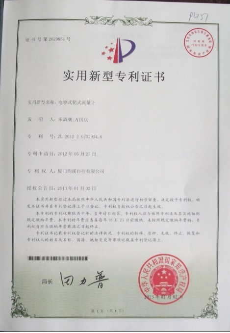 靶式流量計(jì)專(zhuān)利證書(shū)